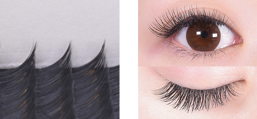 地まつげとの接着面が平らなので装着しやすく、持続力もアップします。毛先までしっかりとボリュームがある形状なので、正面から見た際はしっかりボリュームが、横から見た際はナチュラルに、角度によって様々な印象を与えるエクステンションです。